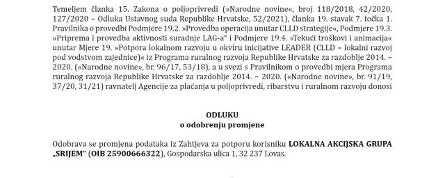 Agencija za plaćanja u poljoprivredi, ribarstvu i ruralnom razvoju u potpunosti je odobrila sve zatražene izmjene od strane LAG-a Srijem, uključujući i prijavljenu treću izmjenu Lokalne razvojne strategije LAG-a Srijem, a koja se odnosi na prilagodbu cjelokupne LRS LAG-a Srijem dodijeljenim sredstvima iz Prijelaznog razdoblja.