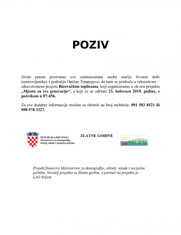 POZIV - Rekreativno - zdravstveni posjet Bizovačkim toplicama